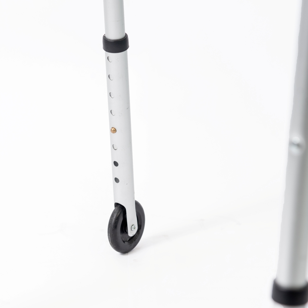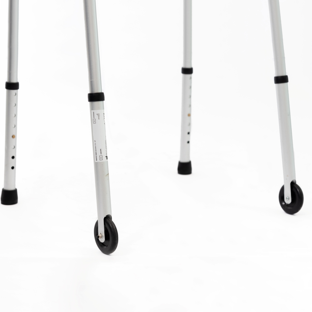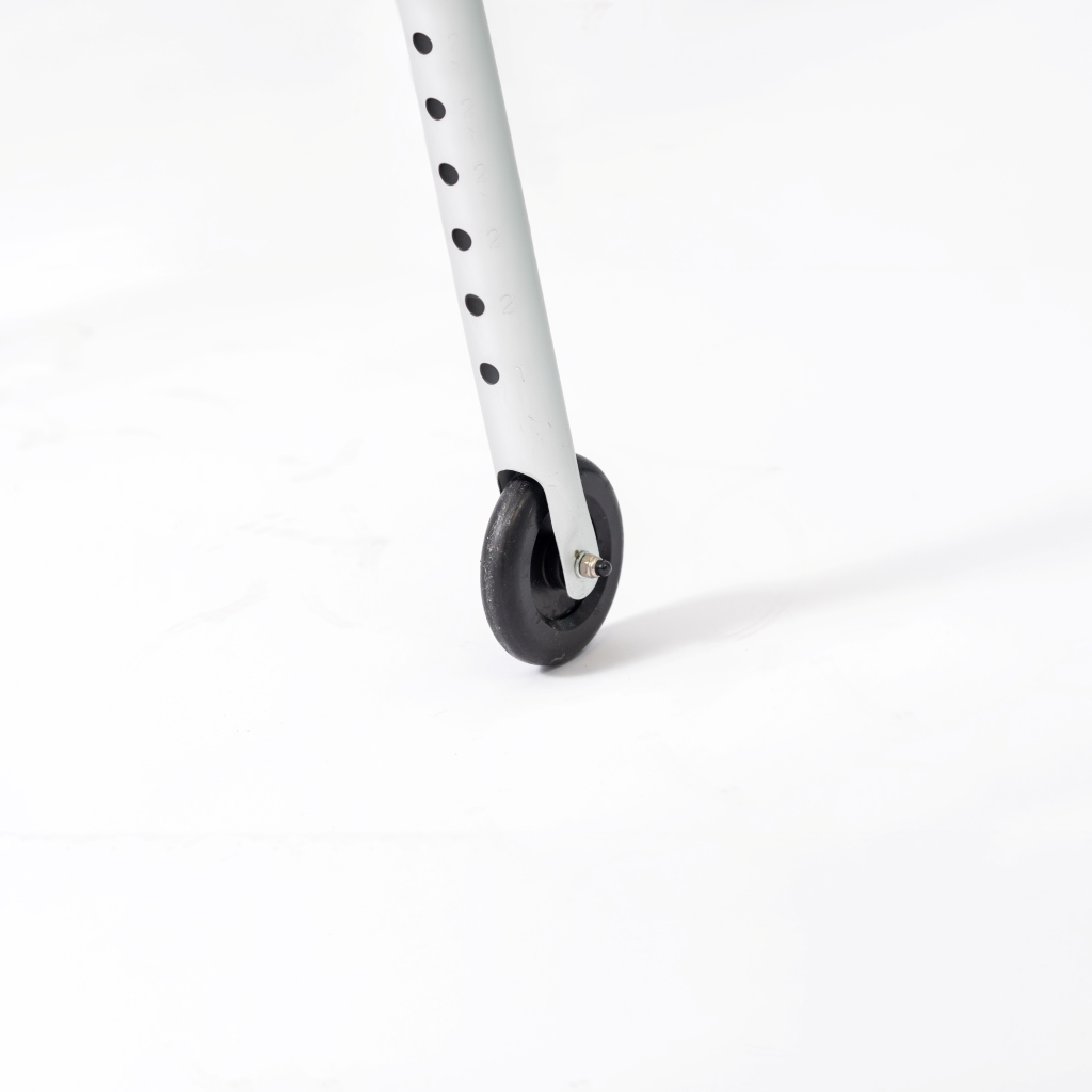 Le due ruote anteriori rendono l’avanzamento più fluido rispetto a un supporto completamente fisso, mentre i puntali antiscivolo posteriori contribuiscono al controllo e alla stabilità.