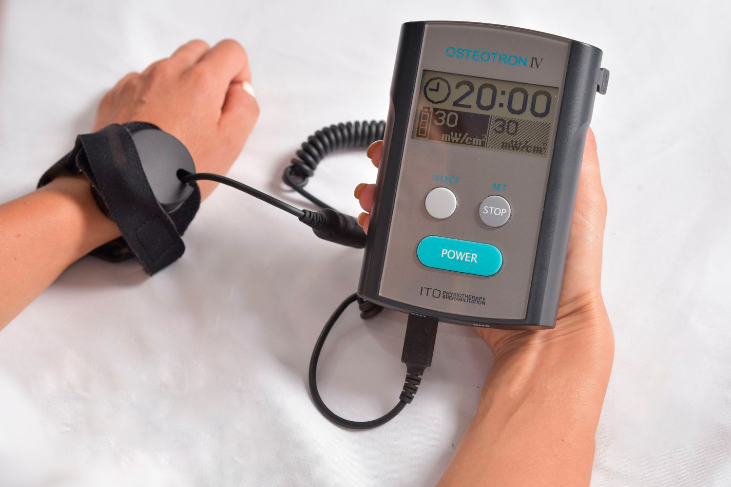 Osteotron IV è un dispositivo non invasivo progettato per trasmettere onde a ultrasuoni attraverso la cute e i tessuti molli fino a raggiungere la sede della frattura. Questa stimolazione attiva specifici recettori cellulari e avvia una serie di reazioni biologiche che sostengono i processi coinvolti nella riparazione ossea.